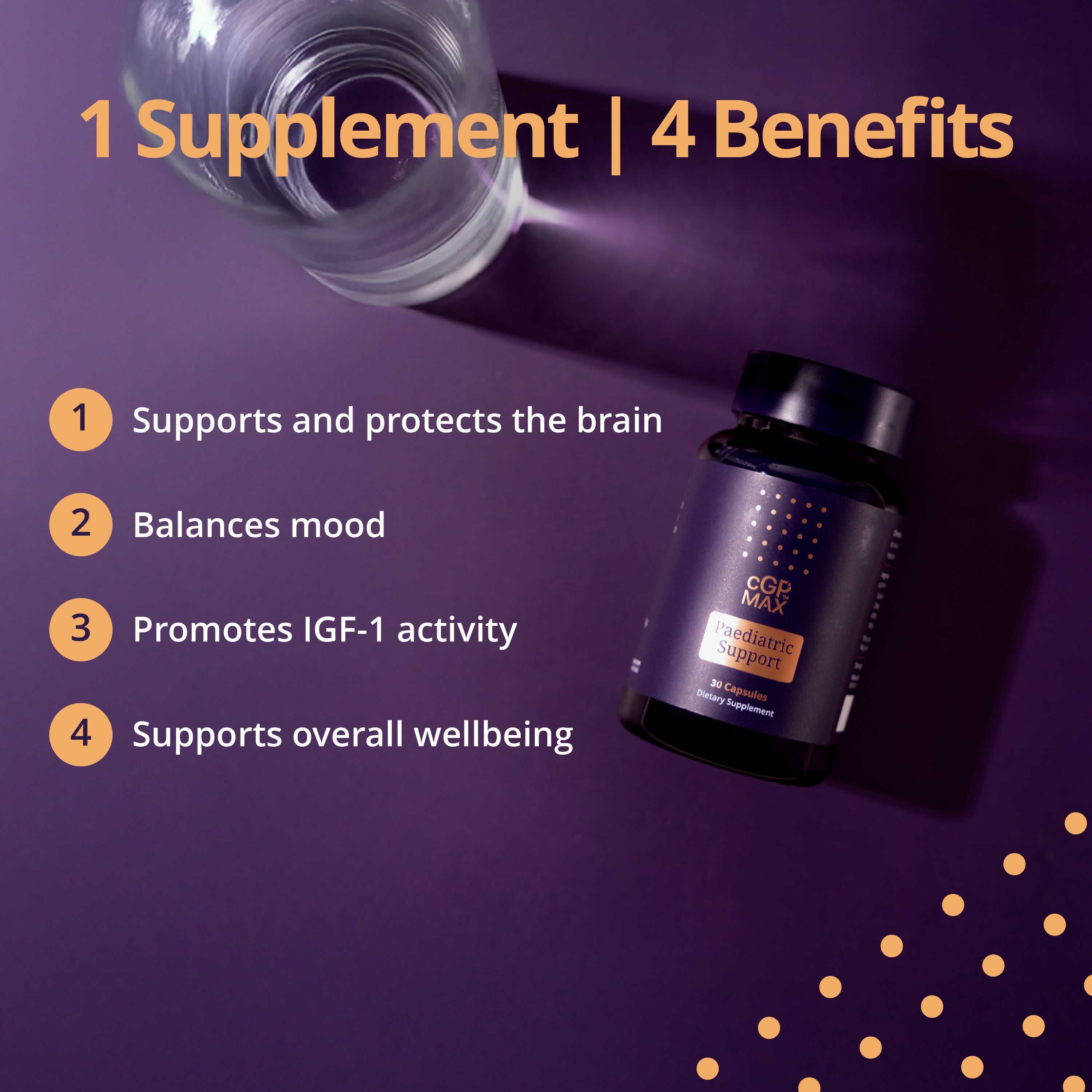 Natural cGP supports healthy IGF-1 function, vital for growth, development, and brain health. cGPMAX® works best for children with highly dysregulated IGF-1 systems. When taken daily, benefits are often noticed after three months, with ongoing improvements from continued use.